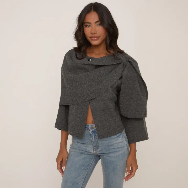 Its flowing cape silhouette and built-in scarf deliver effortless sophistication while keeping you warm in style.