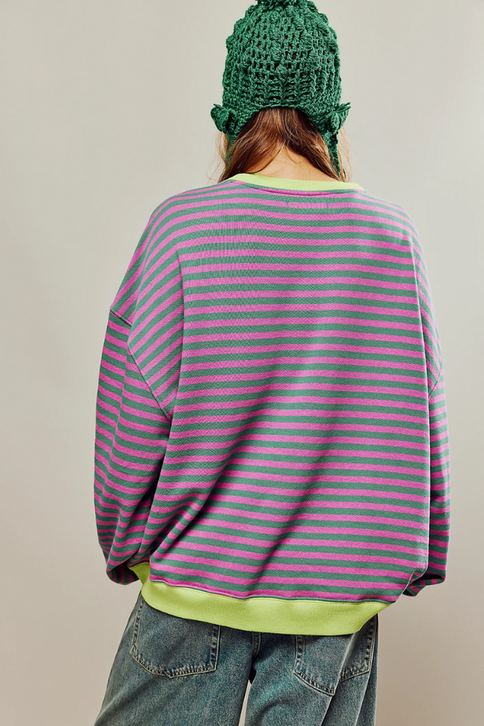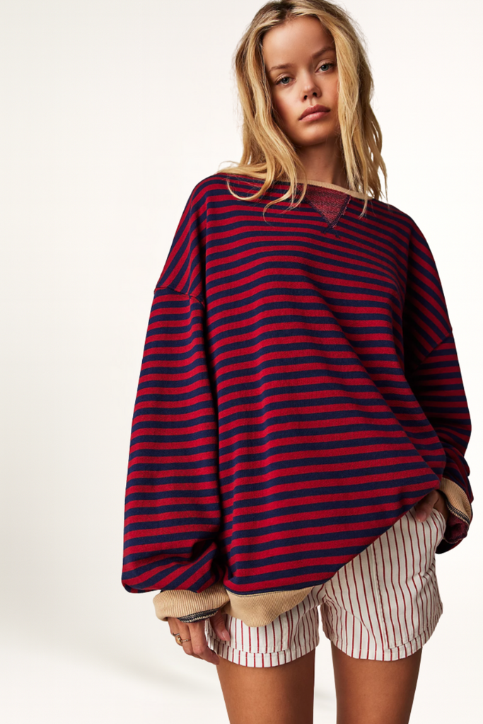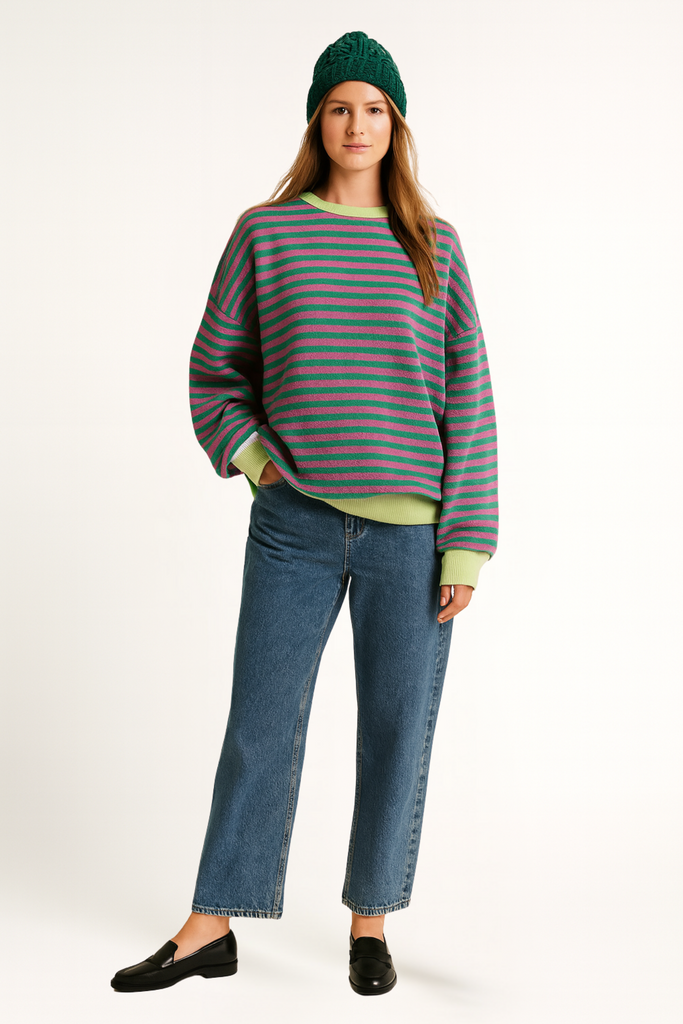 Brighten your wardrobe with Celine Striped Sweater, a cozy oversized knit designed for effortless layering and bold personality.