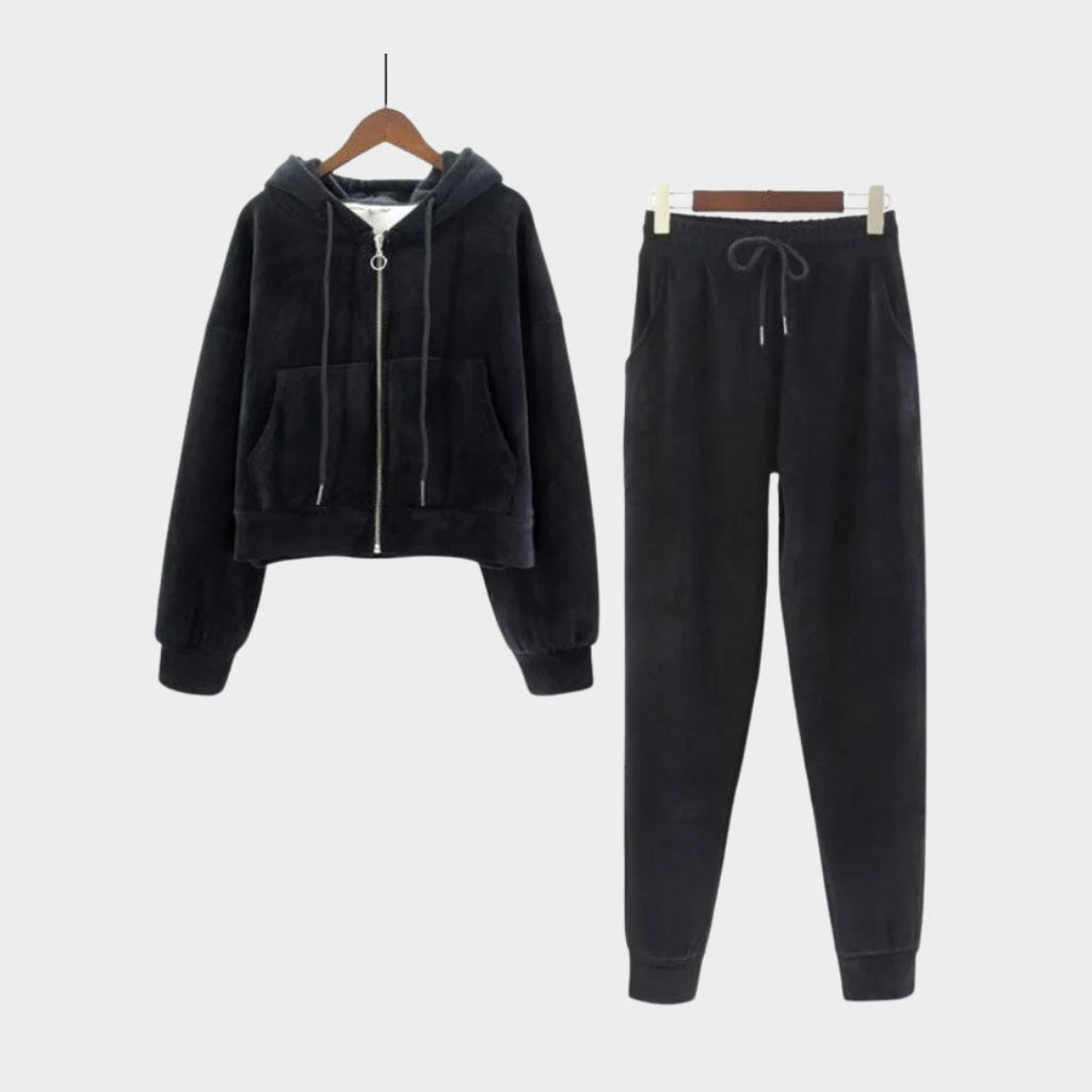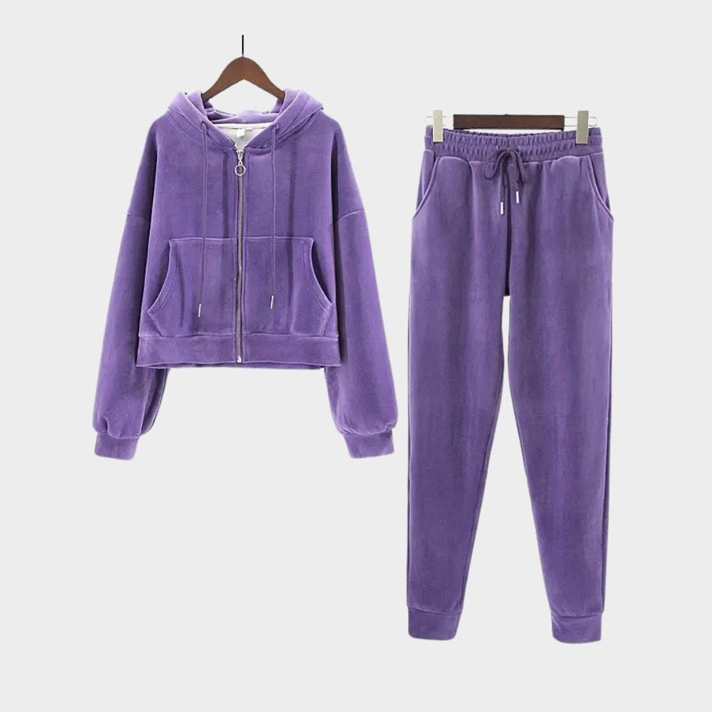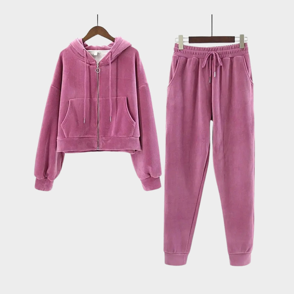 Stay stylish and cozy with this Darcie Tracksuit, designed for effortless comfort in cooler seasons. With its zippered hooded sweatshirt and matching jogging pants, this two-piece set blends casual ease with a touch of refined softness.