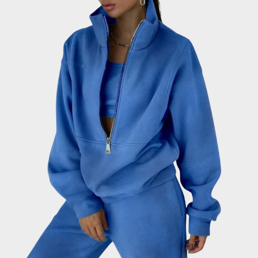 Two-Piece Set – Includes a zip-up sweatshirt and high-waist trousers.