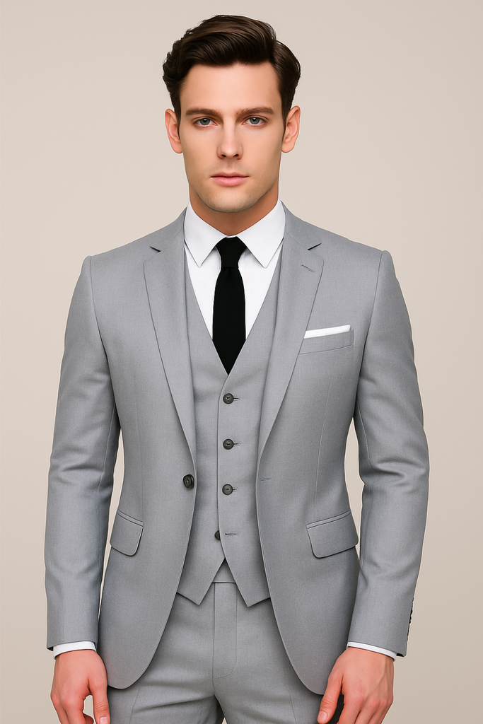 Featuring a coordinated blazer, waistcoat, and trousers, it delivers a sharp silhouette designed for weddings, business meetings, and formal occasions.